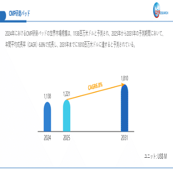 QYResearch調査チームの最新レポート「CMP研磨パッド―グローバル市場シェアとランキング、全体の売上と需要予測、2026~2032」によると、CMP研磨パッドの世界市場規模は2024年に1138百万米ドルと推定され、2025年には1221百万米ドルに達すると予測されています。さらに、2025年から2031年まで年平均成長率(CAGR)6.8%で成長すると予測されています。この成長により、2031年には市場規模が1810百万米ドルに達すると見込まれています。